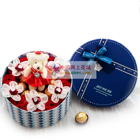 商品簡(jiǎn)介:產(chǎn)品包含:15朵香皂花,9顆費(fèi)列羅巧克力,一只婚禮熊。 禮盒尺寸:直徑20*高12CM