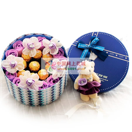 商品簡介:產(chǎn)品包含:15朵香皂花,9顆費(fèi)列羅巧克力,一只婚禮熊。 禮盒尺寸:直徑20*高12CM