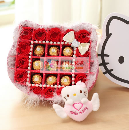 材料包裝: 產(chǎn)品包含:14朵香皂花,9顆費列羅巧克力,一只天使KT貓公仔 禮盒尺寸:長22*27CM