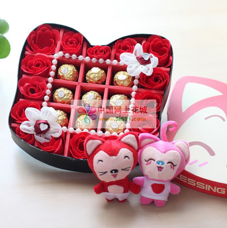 材料包裝: 產(chǎn)品包含:16朵香皂花,9顆費(fèi)列羅巧克力,一只天使KT貓公仔 禮盒尺寸:長(zhǎng)23CM*寬23CM