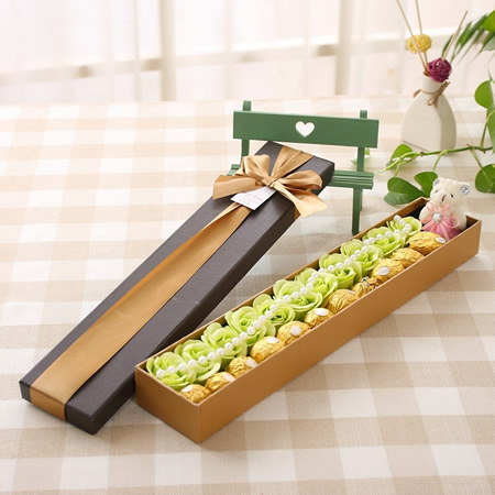 材料包裝: 產(chǎn)品包含:11朵香皂花,11顆費(fèi)列羅巧克力 禮盒尺寸:長(zhǎng)44*寬8.5*高4.5CM
