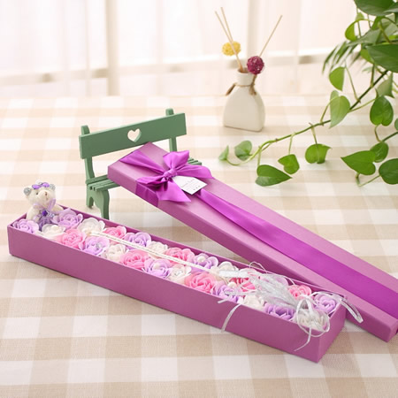 材料包裝: 產(chǎn)品介紹:25朵香皂花+小熊 顏色:淺紫+粉+白 長(zhǎng)44*寬8.5*高4.5CM
