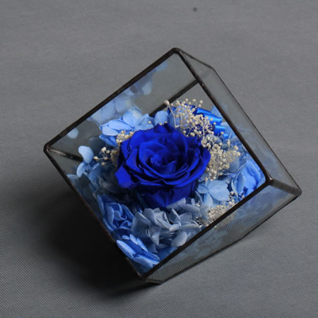 材料包裝: 主材:1朵4-5CM玫瑰, 配材:繡球,緞帶,星星草 尺寸:玻璃盒,10*10*10CM