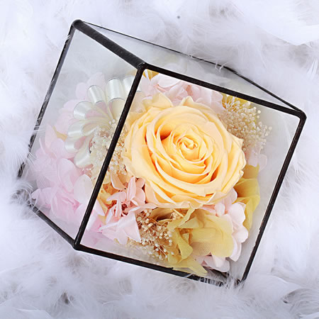 材料包裝: 主材:1朵4-5CM玫瑰, 配材:繡球,緞帶,星星草 尺寸:玻璃盒,10*10*10CM