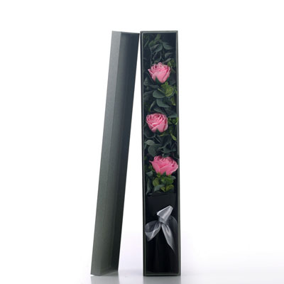 材料包裝: 產(chǎn)品簡稱:3朵粉色香皂花長條盒花束,尺寸:尺寸:65*10*8CM