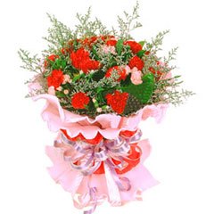 商品簡(jiǎn)介:花材:紅色康乃馨19枝,情人草豐滿。 包裝:粉色卷邊皺紋紙包裝圓形花束。