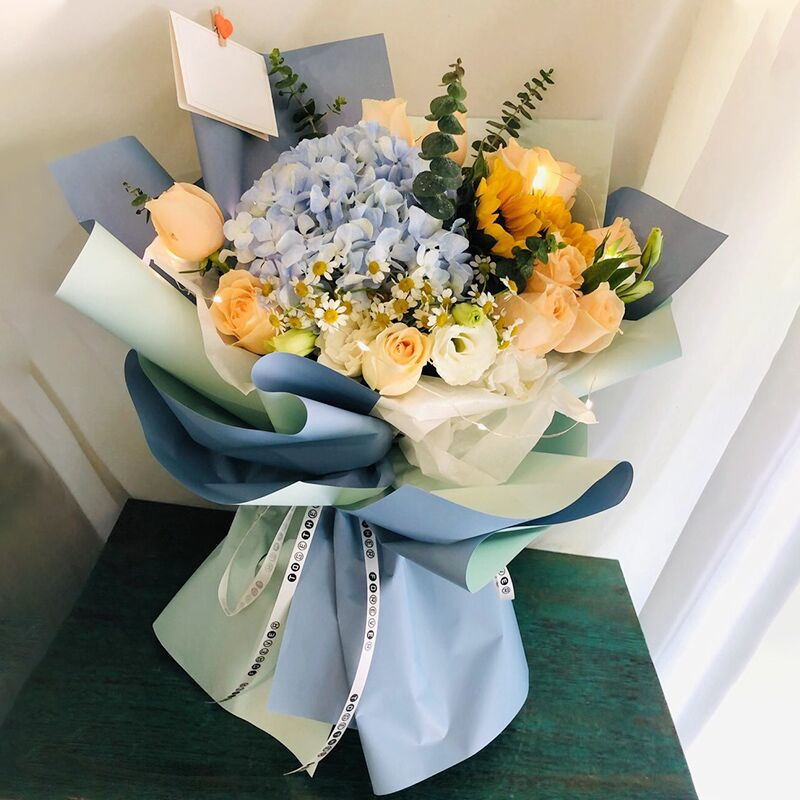 材料包裝: 11只香檳玫瑰,9只洋桔梗,2只向日葵,2只繡球,尤加麗葉,小花若干點綴,燈帶一條,深藍色雙層包裝.