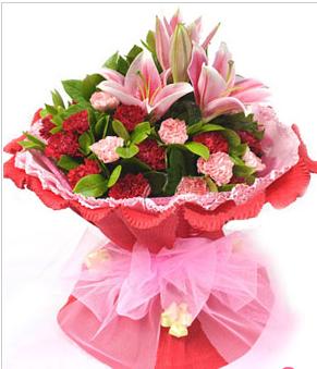 材料包裝: 多頭粉色香水百合1枝,粉色,紅色康乃馨黃28枝,綠葉豐滿。包裝:粉色卷邊紙內(nèi)襯,紅色卷邊紙外圍,粉色紗蝴蝶結(jié)束扎.