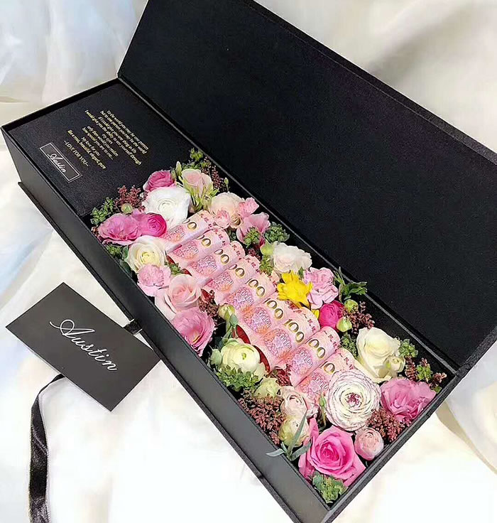 材料包裝: 人民幣花束,33朵玫瑰混搭,配草,高檔禮盒裝,(禮盒顏色店里隨機)。注:人民幣數(shù)量可以單獨定制,圖上是9張。