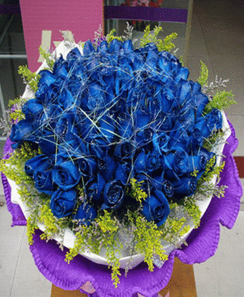 商品簡(jiǎn)介:藍(lán)玫瑰99枝 黃鶯 商品包裝:內(nèi)襯棉紙,外層紫色卷邊紙圓形包裝