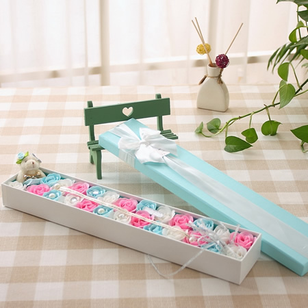 材料包裝: 產(chǎn)品介紹:25朵香皂花+小熊 顏色:淺藍(lán)+粉+白 長(zhǎng)44*寬8.5*高4.5CM