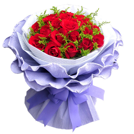 材料包裝: 21支紅玫瑰 黃鶯搭配 白色皺紋紙內(nèi)襯 紫色皺紋紙外襯