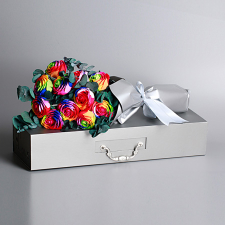 商品簡介:11支七彩香皂花半花束,12*21*60CM禮盒裝