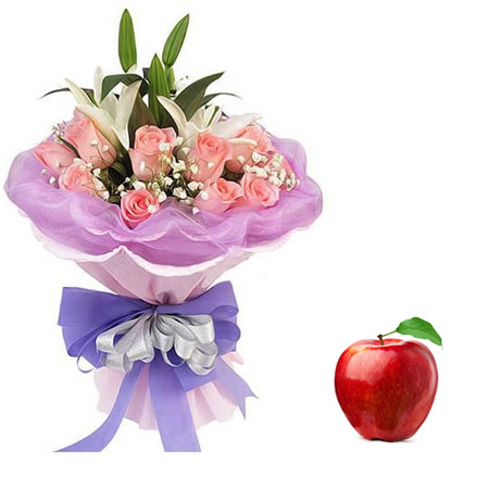 商品簡介:粉玫瑰12枝 白色多頭百合2枝 1個平安果,滿天星 黃鶯 商品包裝:里圍粉色細網(wǎng)紗,外圍粉色卷邊紙包圓形