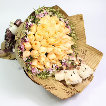材料包裝: 花材:33支香檳玫瑰,2只小熊,搭配情人草,石竹梅;包裝:英文報(bào)紙包裝,蝴蝶結(jié)扎尾