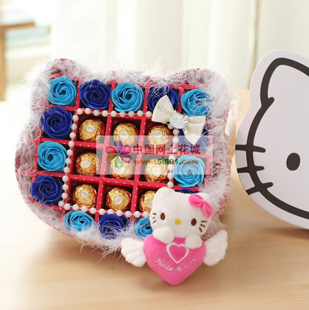 材料包裝: 產(chǎn)品包含:14朵香皂花,9顆費(fèi)列羅巧克力,一只天使KT貓公仔 禮盒尺寸:長(zhǎng)22*27CM