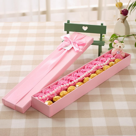 材料包裝: 產(chǎn)品包含:11朵香皂花,11顆費(fèi)列羅巧克力 禮盒尺寸:長44*寬8.5*高4.5CM